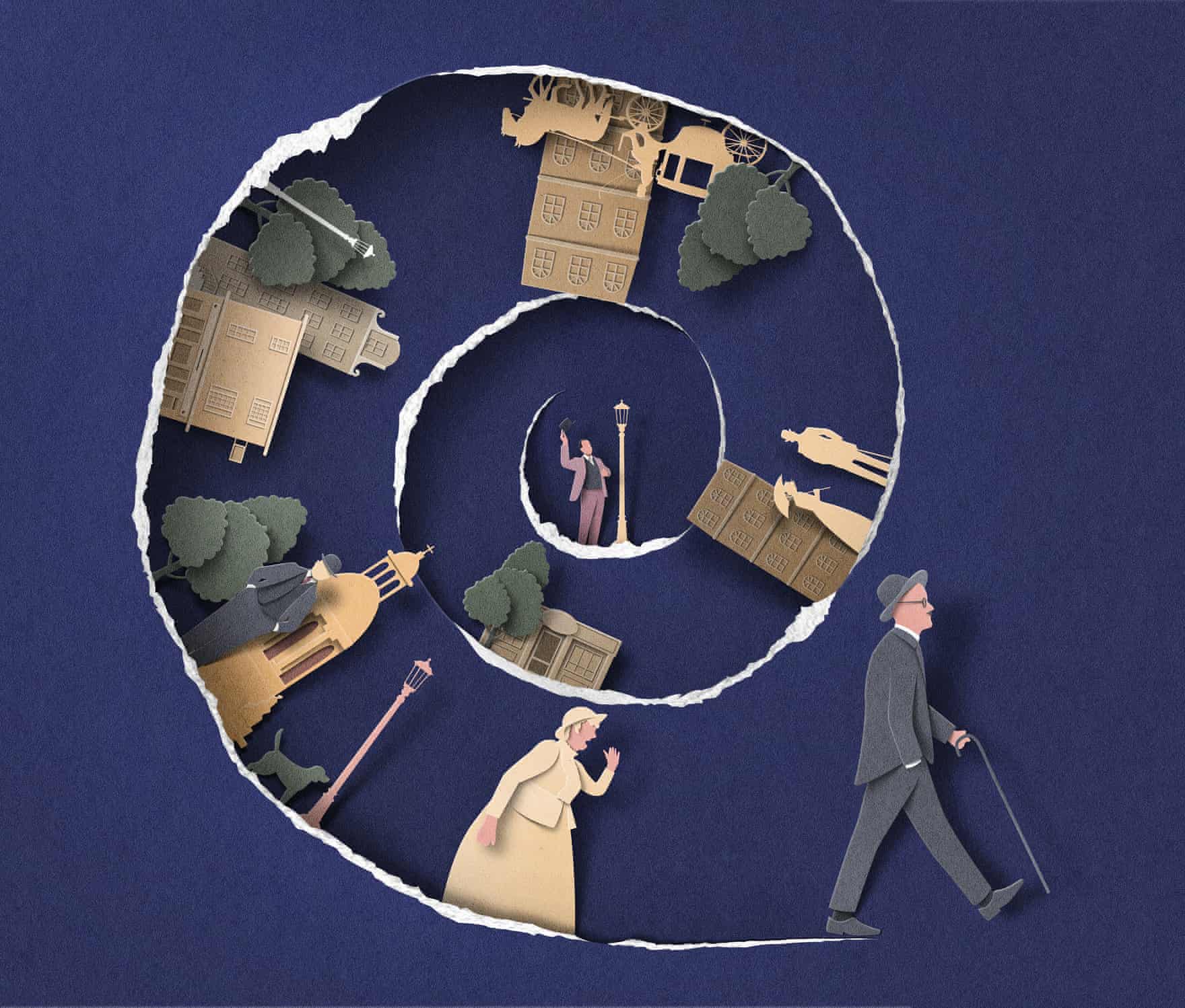 Las calles por las que caminan los hombres fueron investigadas obsesivamente por Joyce, quien luego se negó a describirlas para el lector de cualquier manera convencional. A medida que pasan las horas, sus mentes se vuelven más porosas para el mundo. Las voces interrumpen, los pensamientos se entrometen. Ya no sabemos quién está contando la historia, o desde qué punto de vista.